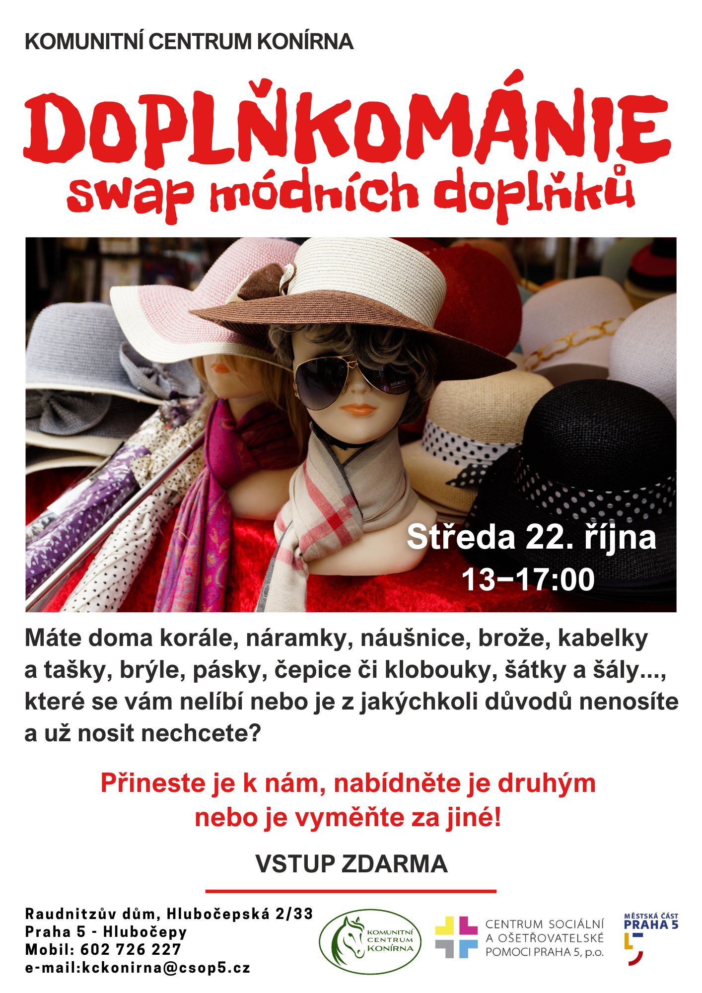 20/10/2025Možná to ani netušíte a skříň máte plnou módních doplňků, které jste už léta nezvali na sebe. A tak zkuste otevřít šuplíky se šátky a šálami, skříň s čepicemi a klobouky, proberte svou sbírku slunečních brýlí i krabici s bižuterií a vytřiďte, co nenosíte a nosit nechcete. Se vším pak můžete zamířit do komunitního centra Konírna v Hlubočepích, kde se ve středu 22. října od 13 do 17 hodin koná swap, neboli výměna, módních doplňků.