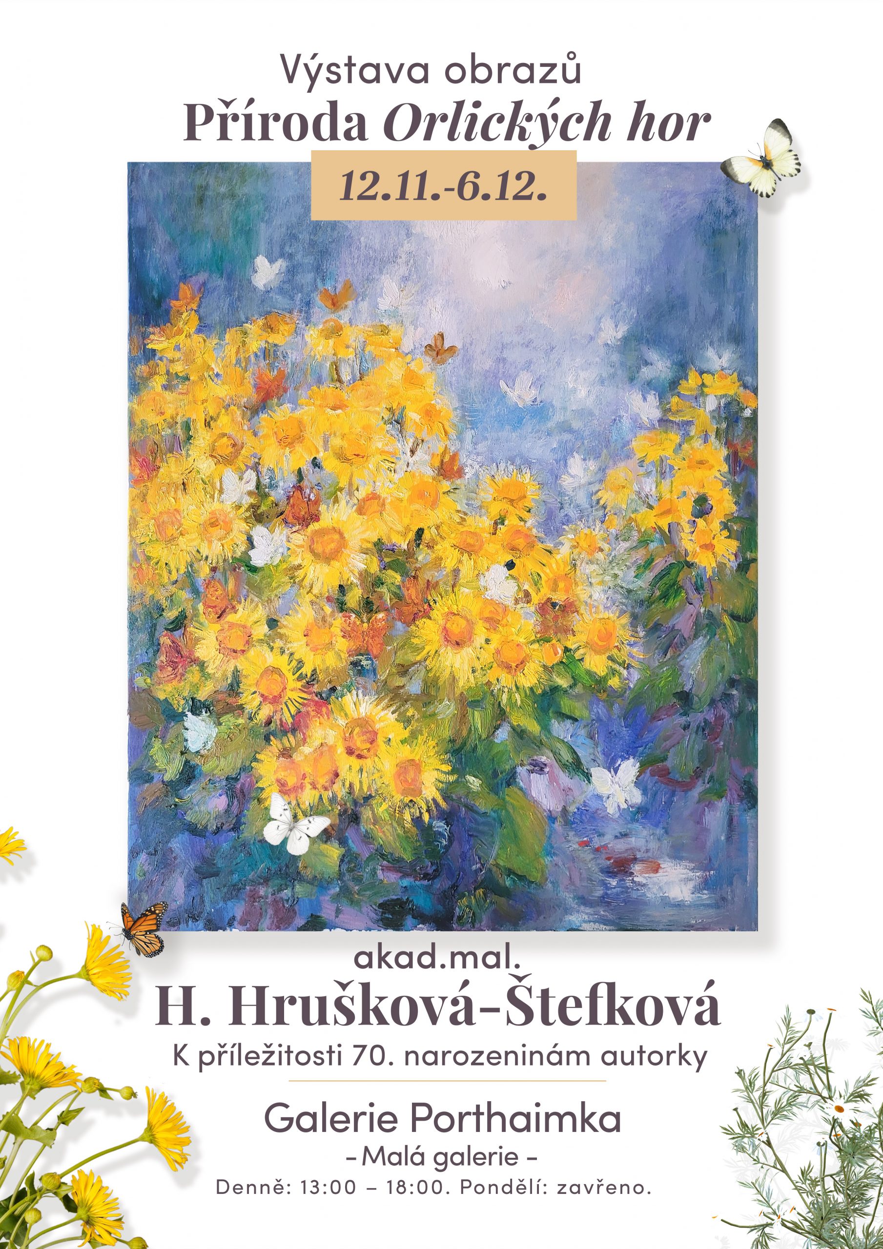 04/11/2025Akademická malířka Helena Hrušková- Štefková zve 12. listopadu od 18 hodin do Malé galerie v letohrádku Portheimka na vernisáž výstavy obrazů, na kterých zachytila přírodu Orlických hor.
