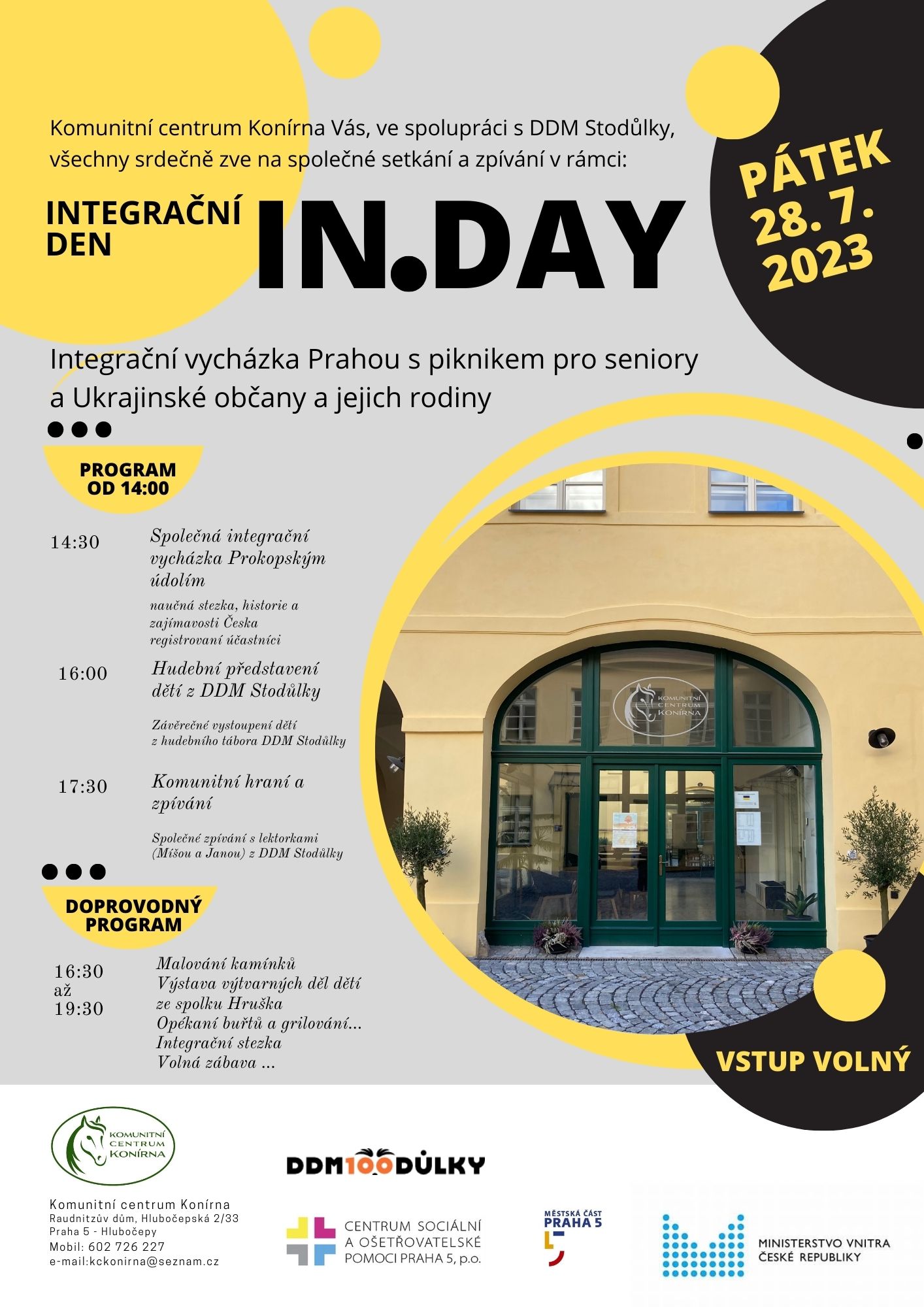 Integrace cizinců je důležitým tématem, kterým se společnost stále více zabývá. Jednou z možností, jak podpořit integraci a propojit různé skupiny lidí, je organizace společných setkání a tím je právě i IN.Day – Integrační den pořádaný v pátek 28. července v Komunitním centru Konírna v Raudnitzově domě. Přijďte si užít společně poznávací stezku hlubočepskou přírodou, kde budou senioři společně s cizinci sdílet své znalosti, zkušenosti či zajímavosti z kulturního bohatství svých národů. Účastníky mohou být nejen senioři a Ukrajinci, kteří navštěvují kurzy ČJ v komunitním centru a jejich rodinný příslušníci. IN.Day je otevřený široké veřejnosti. Po společné vycházce všechny čeká zábavné odpoledne na dvoře Raudnitzova domu, kde bude probíhat i doprovodný program – malování kamínků, komunitní zpívání lidových písní a proběhne i hudební vystoupení dětí z DDM Stodůlky. Společné zpívání bude krásným prvkem celé akce, protože hudba má velkou sílu, která dokáže spojit lidi a překonat i jazykové bariéry.