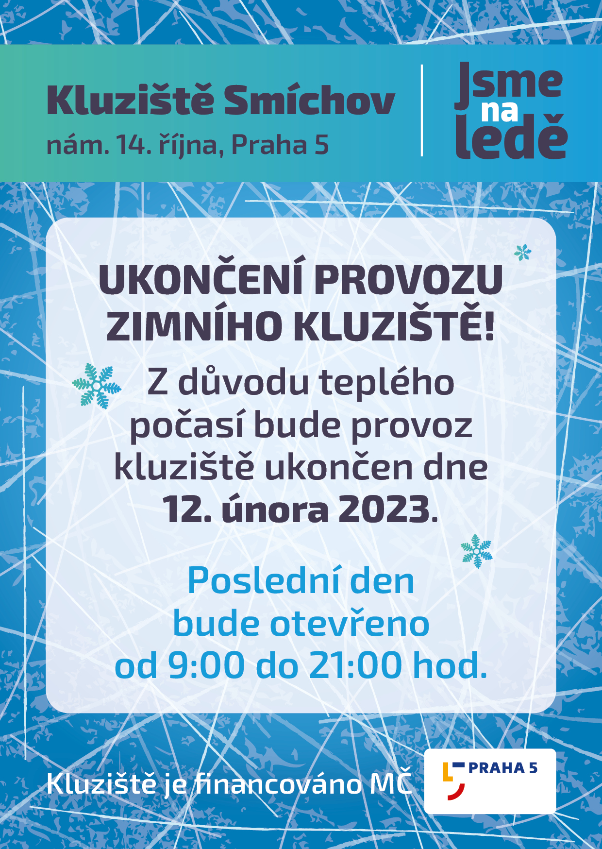 V letošním roce ukončujeme kluziště na Smíchově již dříve, z důvodu očekávaného oteplení. V neděli 12.2.2023 je možné si přijít naposledy zabruslit od 9:00 do 21:00 hodin.