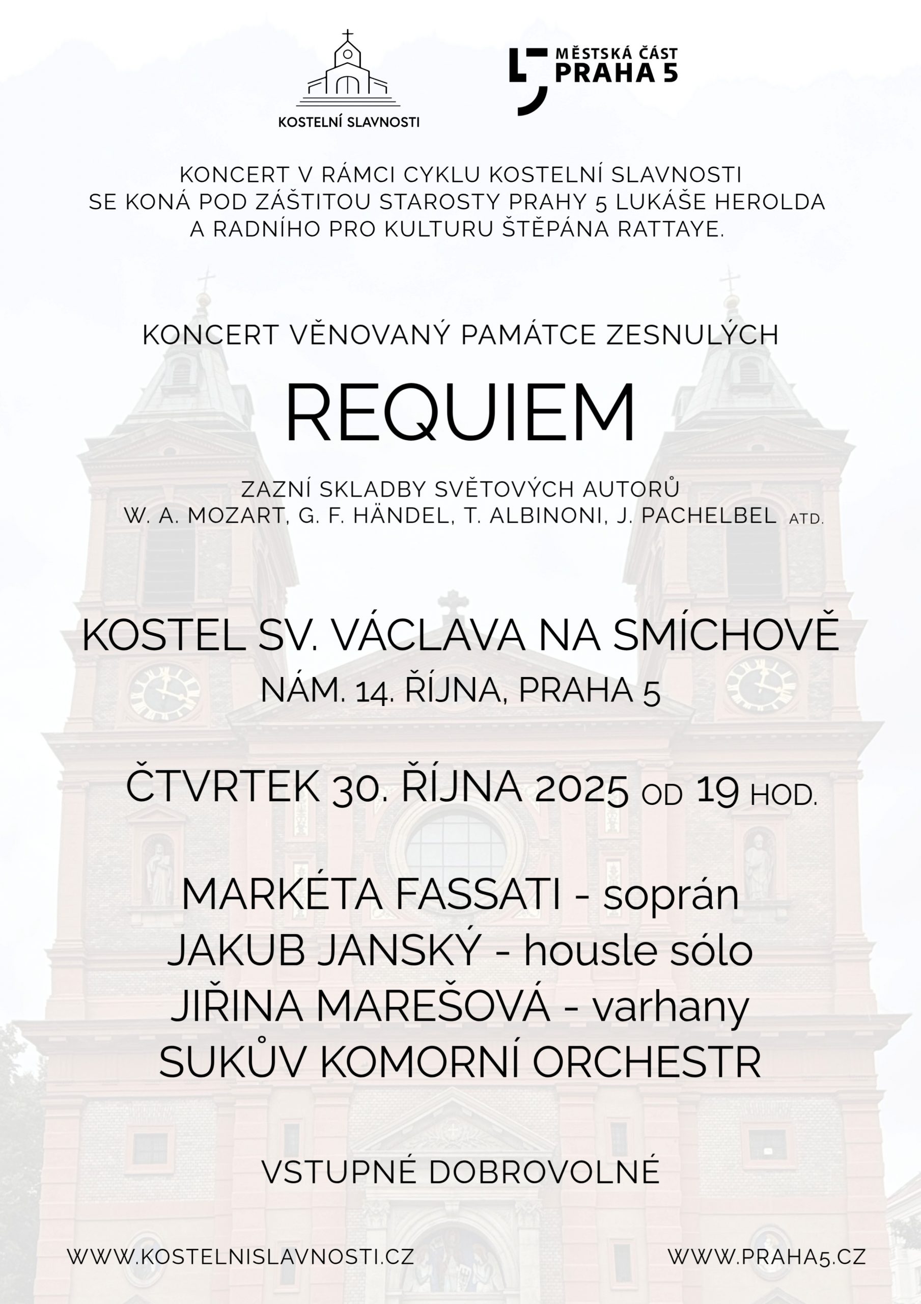 22/10/2025Srdečně zveme na koncert věnovaný památce zesnulých – Requiem, který rozezní smíchovský kostel sv. Václava ve čtvrtek 30. října od 19 hodin.