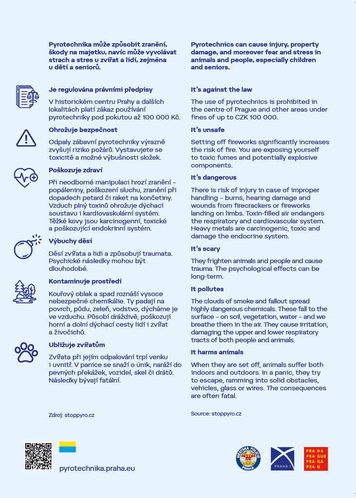 Od 1. prosince 2025 platí v České republice novela zákona o pyrotechnice, která zpřísňuje pravidla pro prodej a používání zábavní pyrotechniky. Oslavy příchodu nového roku budou v Praze omezené v rámci používání pyrotechniky téměř stejně, jako tomu bylo v posledních letech. Vyhláška metropole totiž většinu novinek v zákoně obsahuje již několik let. Veškeré detaily včetně mapy jsou k dispozici na stránkách pyrotechnika.praha.eu.