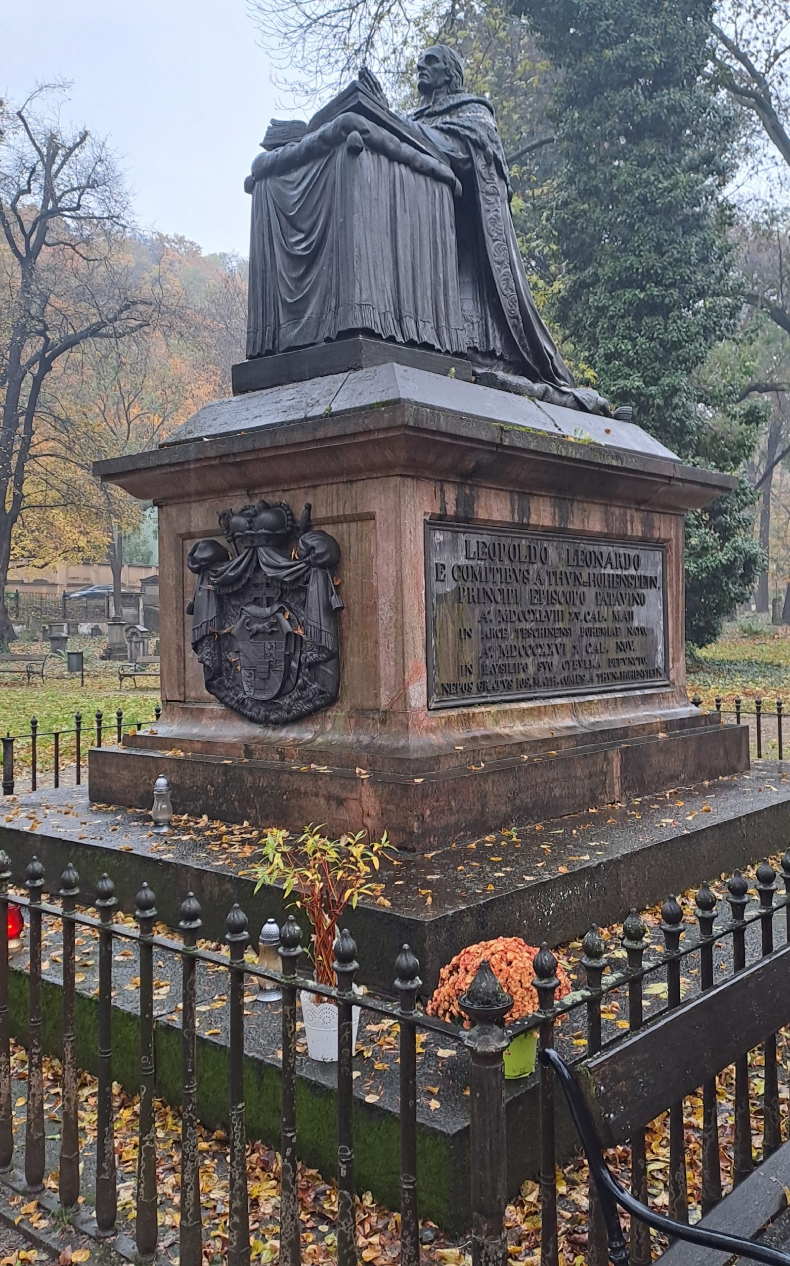 Autorem monumentálního pomníku, který stojí nedaleko hlavního vchodu, je sochař Václav Prachner. Kovové části byly odlity v roce 1835 u Dominika Zafouka. Skulptura znázorňuje klečícího biskupa s rukama spojenýma k modlitbě. Před ním se nachází otevřená kniha, na níž spočívají biskupovy ruce.