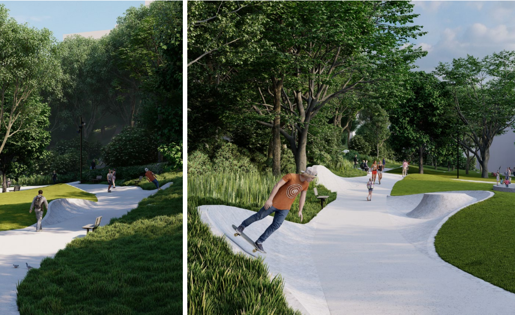 Počítá se i s prvky umožňujícími trikovou jízdu na skateboardech, vizualizace Jakub Cigler Architekti