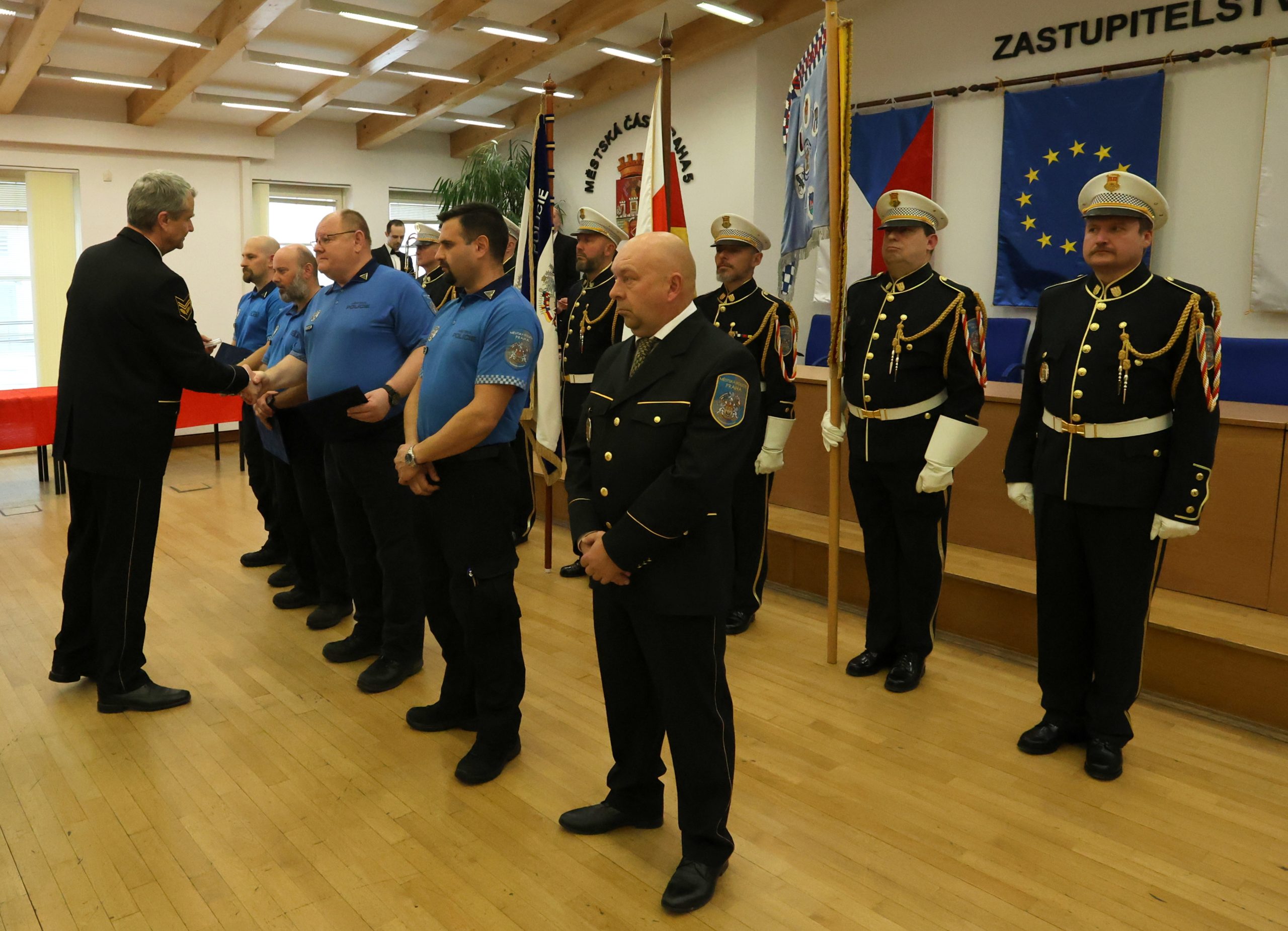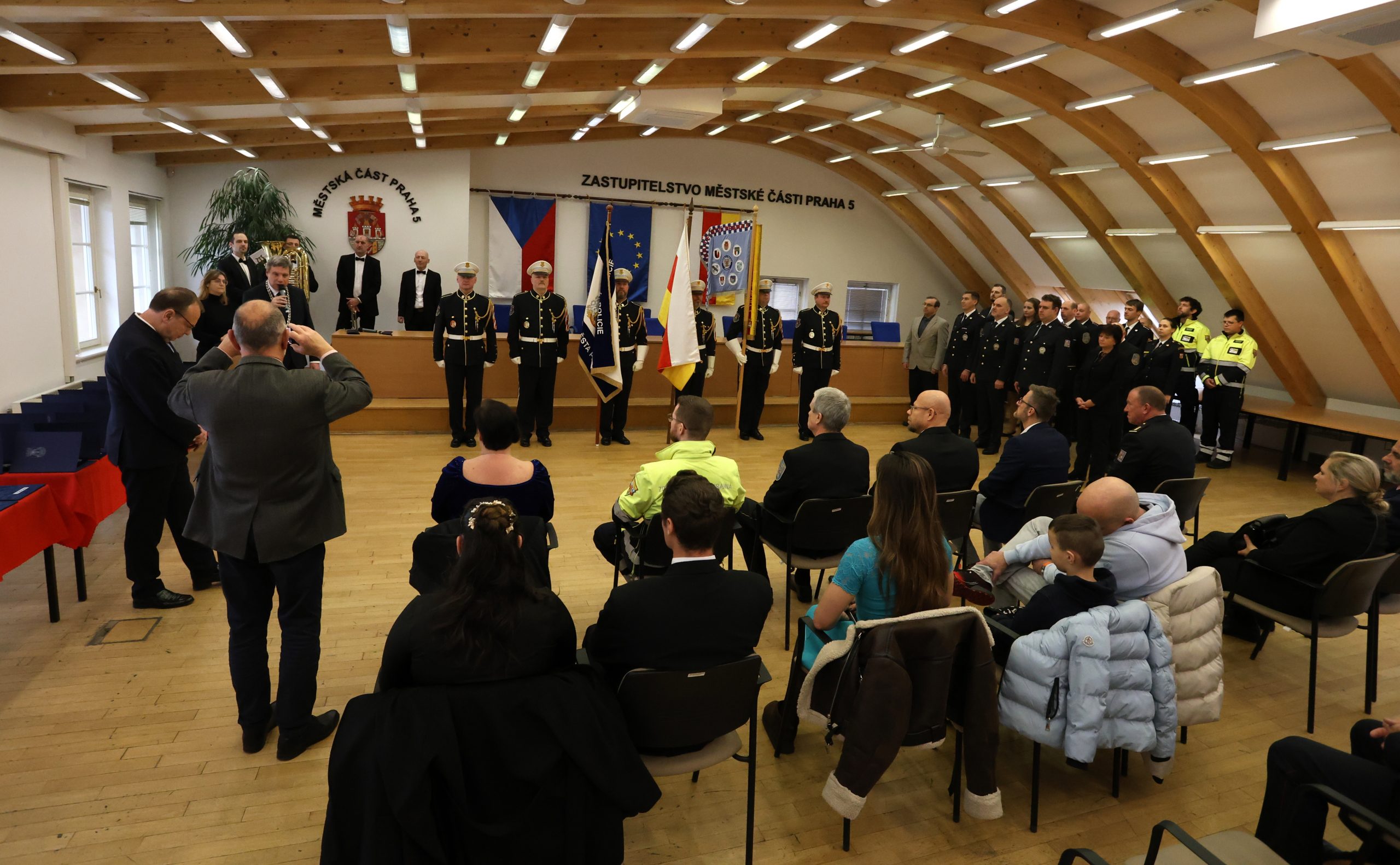 Husitský chorál Ktož jsú boží bojovníci zahájil slavnostní předávání Medailí Rady MČ Praha 5 za mimořádné zásluhy v roce 2025 členkám a členům bezpečnostních a záchranných složek a také stužek za věrnost strážníkům Městské policie hl. m. Prahy, které se uskutečnilo v zasedacím sále smíchovské radnice. Na slavnostním aktu nechyběli rodinní příslušníci oceněných.