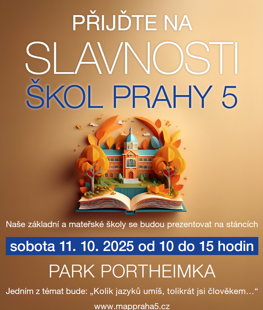 Přehlídka mateřských a základních škol, které působí v Praze 5, se koná v sobotu 11. října od 10 do 15 hodin v parku Portheimka vedle smíchovského kostela sv. Václava. Jedním z témat, která se na prezentaci objeví, budou jazyky.