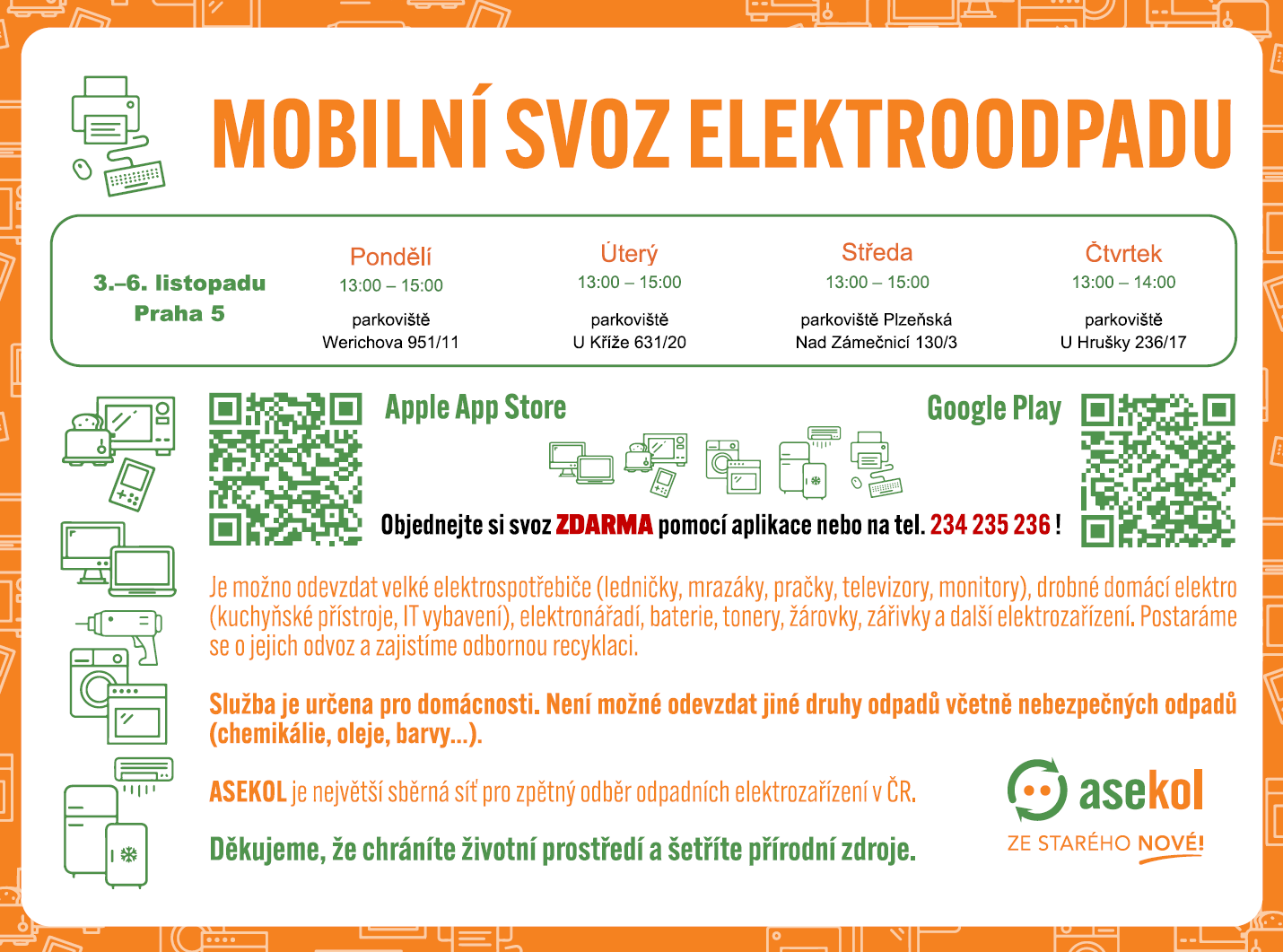 31/10/2025Další kolo mobilních svozů se v Praze 5 plánuje v listopadu. Stejně jako v předchozích kolech bude automobil odpoledne k dispozici na stabilním místě. V dopoledních hodinách (8-13) se elektrozařízení budou odvážet přímo z domácností, podle objednávek od občanů. Akce se uskuteční od tohoto pondělí do čtvrtka.