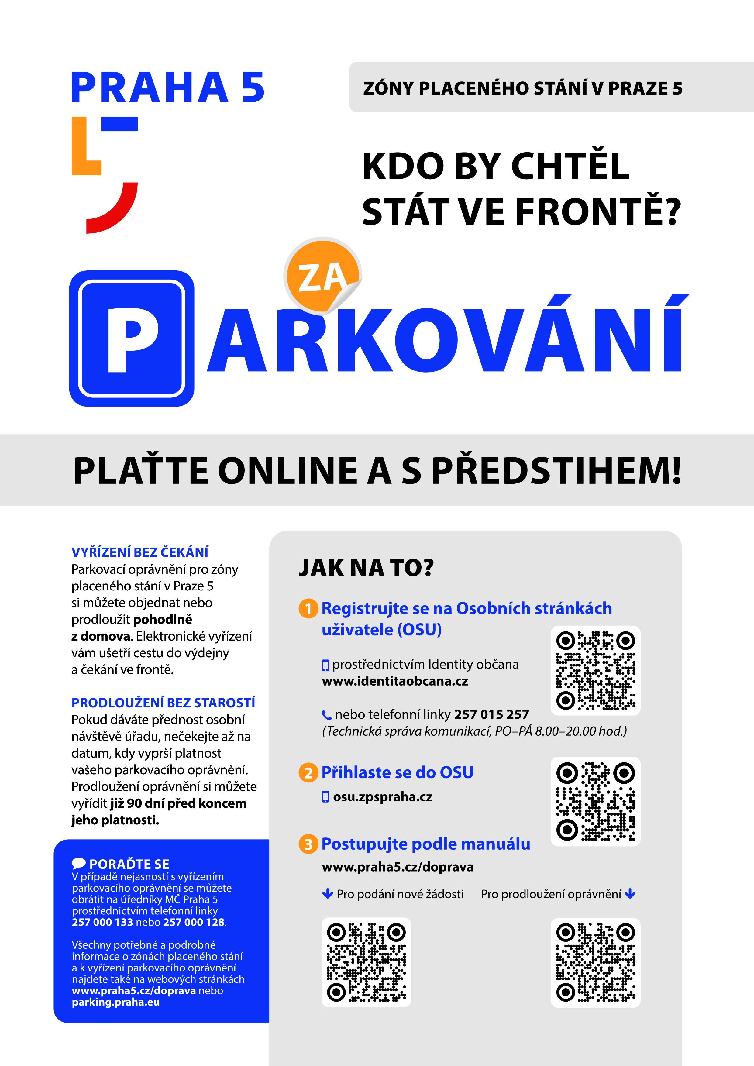 Kdo by chtěl stát ve frontě? Za parkování můžete platit online a s předstihem. Chcete si požádat o parkovací oprávnění pro zóny placeného stání v Praze 5? Nebo si chcete prodloužit jeho platnosti?